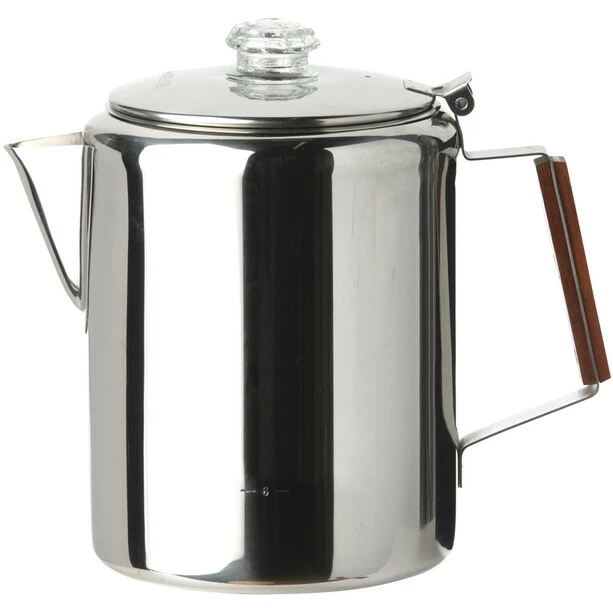 Large stainless steel coffee pot of 18/8 steel with two-piece percolator insert and transparent plastic knob to control the brewing process. Perfect for fresh coffee from the camp stove.