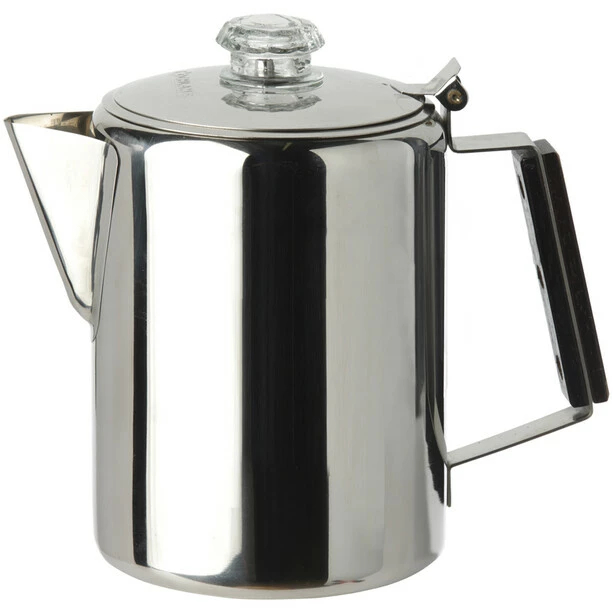Large stainless steel coffee pot of 18/8 steel with two-piece percolator insert and transparent plastic knob to control the brewing process. Perfect for fresh coffee from the camp stove.