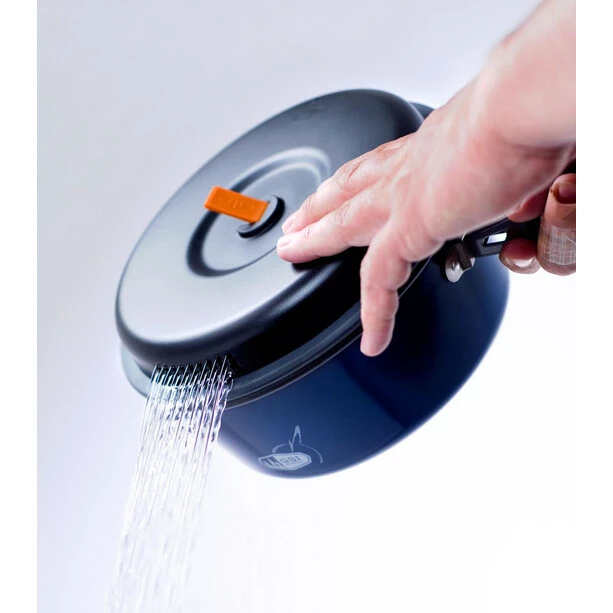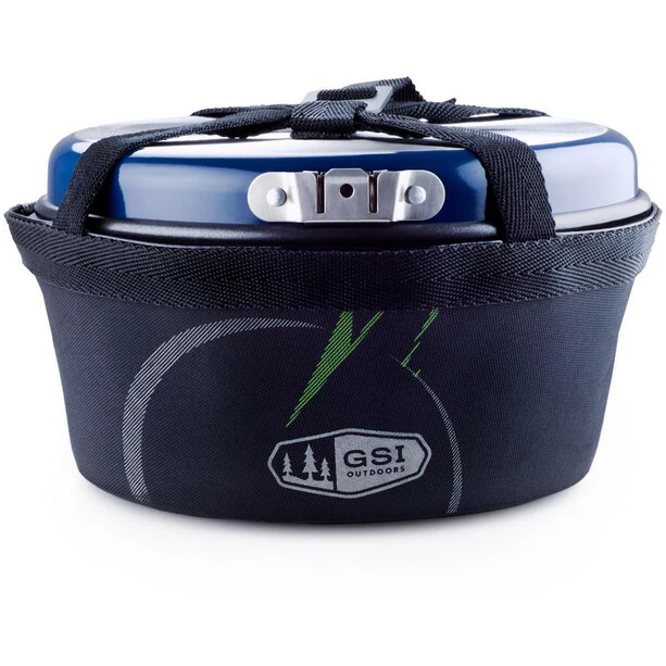 Pot set for cooking and eating with insensitive, light and very beautifully processed aluminium pot (2 L) with Teflon coating. A pot and a pan with GSI folding handle for safe handling and easy straining of the contents. A lid (for pot and pan) and turned bottoms provide support and energy-saving cooking. The 4 cups are made of polypropylene. The triangular cups can be stacked one inside the other (make 4 cups out of 2). The interior is also designed individually as an iso-cup (400 ml) and covered with a removable neoprene insulation, equipped with a lid and stowable in a space-saving pot set. The colours make the cups easy to match. Supplied in a sturdy transport bag, which can also be used as a wash bowl. In addition, the GSI Crossover Kitchen-Kit with many small cooking utensils is recommended. Due to its semicircular shape, the set can be perfectly stored in the pot.