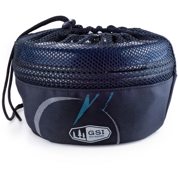 The Base Camper series from GSI offers best quality pot materials, a sophisticated equipment and a very good finish. Bugaboo has a Teflon coating, which guarantees good handling and easy cleaning as well as abrasion and scratch resistance of the pots. The set contains two pots, a lid pan, two pouring lids, the practical cutting board (also serves as an intermediate layer for the pots so that they do not rattle during transport), the GSI comfort grip pliers and a packing bag.