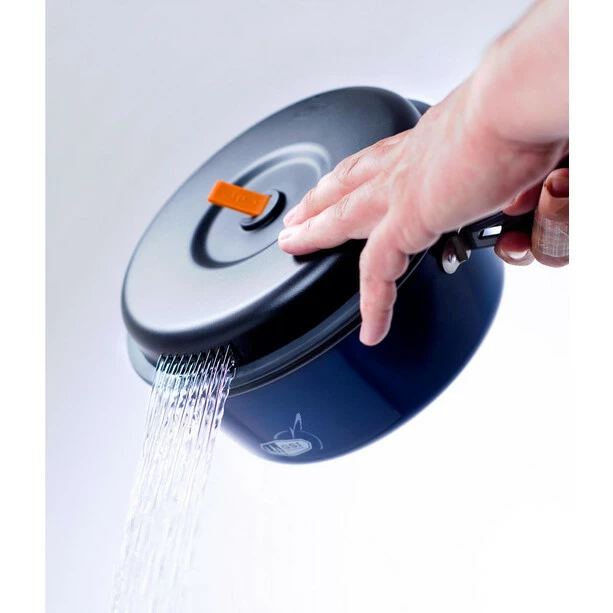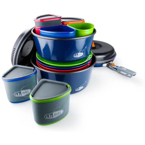 Two pots and a pan with GSI folding handle for safe handling and easy straining of the contents. Two lids (for pot and pan) and turned bottoms provide support and energy-saving cooking. The four plates (d 19 cm) and 8 cups are made of polypropylene. The triangular cups can be stacked into each other. The interior is also designed individually as an iso-cup (400 ml) and covered with a removable neoprene insulation, equipped with a lid and stowable in a space-saving pot set. The colours make the plate and cups easy to match.