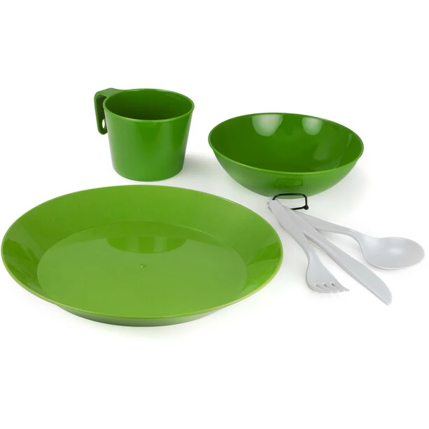 The lightweight, reusable Cascadian 1-person table set from GSI Outdoors has everything you need for a single plate set and is easy to pack, stack and transport for all your outdoor dining needs. The set includes a 9.5-inch (24.13cm) plate, a 6-inch (15.24cm) bowl, a 12-ounce (355ml) mug and a full-size fork, knife and spoon.