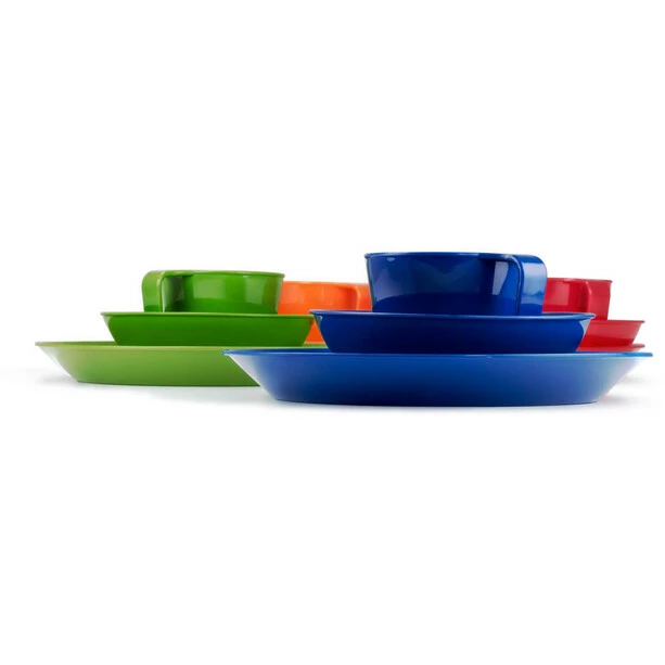 Light set of plastic dishes for 4 persons, each with a cup (350 ml), a bowl and a plate. The individual sets are colour-coordinated to make them easier to personalise. An unbreakable and easy-care basic set. Packed in a practical mesh protection bag.