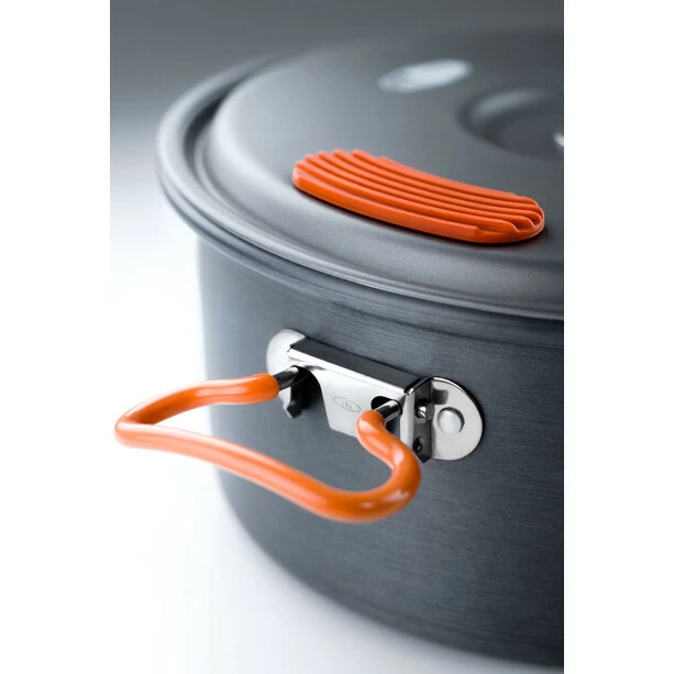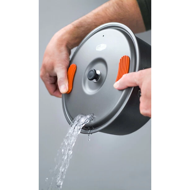 Halullite hard anodized aluminum provides superior conductivity to titanium at comparable weight, the Halulite 4.7 L Pot cooks more efficiently allowing you to go farther while carrying less fuel. The integrated silicone thumb pads on lid make straining pasta safe and secure.