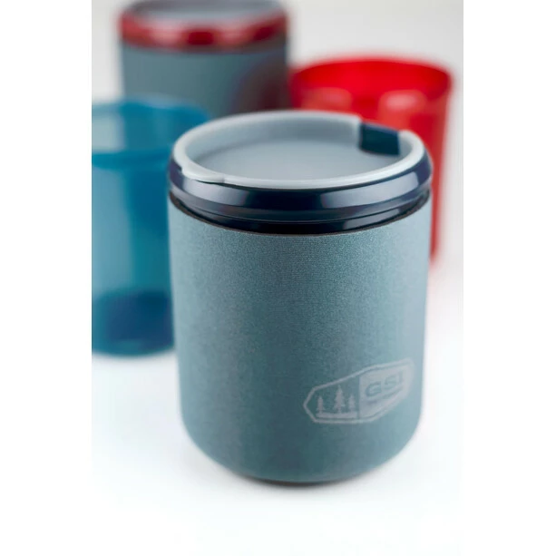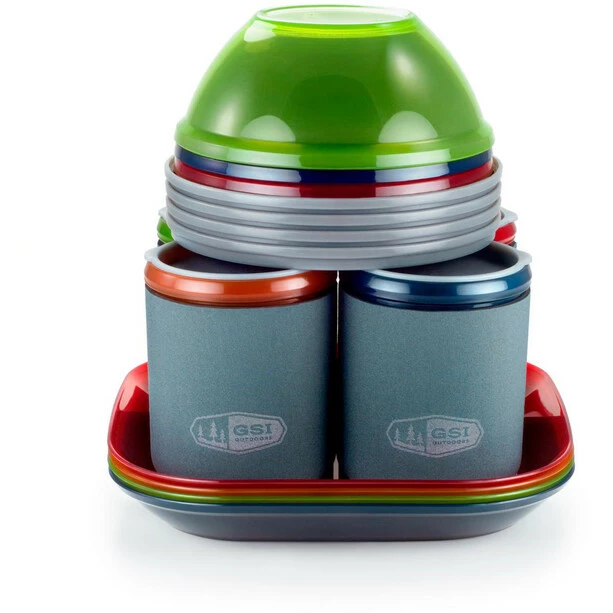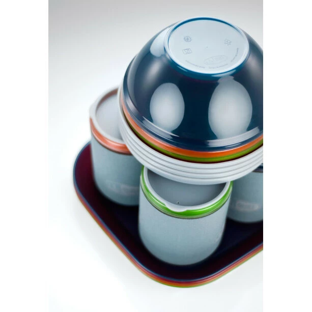 This light crockery set for 4 persons has 4 plates and cups, 4 more iso-cups and four bowls with lockable lid. Each set has its own colour, so plates and cups are easier to match. All made of light BPA-free plastic, which is also 100% recyclable. The whole set can be stowed very compactly in the net bag supplied. Ideal for camping.