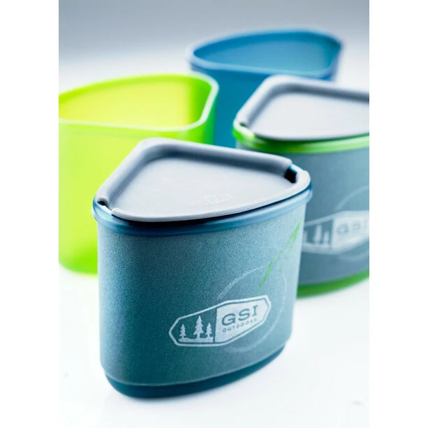 Cooking at the highest level. Perfect pot set for cooking and eating with insensitive, light and very beautifully processed aluminium pot (2 L) with extreme Teflon Pinnacle coating. A pot and a pan with GSI folding handle for safe handling and easy straining of the contents. A lid (for pot and pan) and turned bottoms provide support and energy-saving cooking. The 4 cups are made of BPA-free polypropylene. The triangular cups can be stacked one inside the other (make 4 cups out of 2). The interior is also designed individually as an iso-cup (400 ml) and covered with a removable neoprene insulation, equipped with a lid and stowable in a space-saving pot set. The colours make the cups easy to match. Supplied in a sturdy transport bag, which can also be used as a wash bowl. In addition, the GSI Crossover Kitchen-Kit with many small cooking utensils is recommended. Due to its semicircular shape, the set can be perfectly stored in the pot.