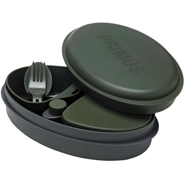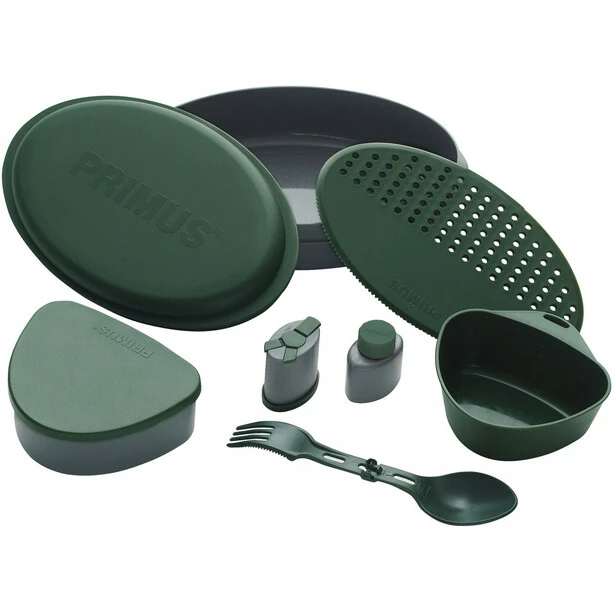 Practical, 8-piece outdoor eating kit with everything you need underway. 2 deep plates, a 3 compartment condiment cellar, a small container for oil or washing-up liquid, a tightly closing ration box, mug, folding fork/spoon combination and a multifunction bread board which serves as a sieve, grater or knife. Suitable for microwaves and dishwasher.