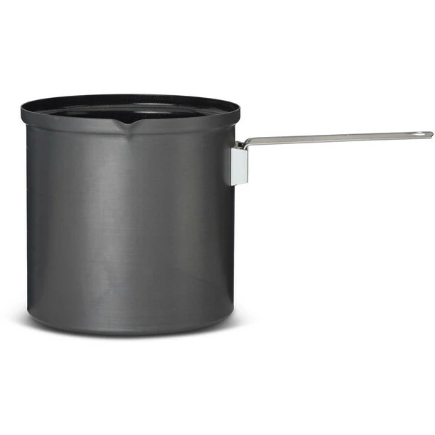 The 1.0 litre pot is made of hard anodised aluminium and has a non-stick ceramic coating. The pot has a slightly thicker bottom, so the temperature is distributed evenly without burning. The spiral pattern in the bottom of the pot additionally promotes heat transfer. The pan, which is also made of hard anodised aluminium and has a ceramic non-stick coating, can also be used as a lid. One of the handles gives you a firm grip when the pot is in use and secures the lid/pan when the set is stowed away. The other handle is attached to the pan, so you can use the pan and the pot at the same time. It can be easily stored in the pot after cooking.