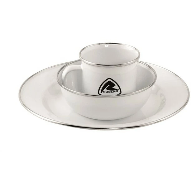 The Robens Tongass Enamel Set consists of a plate, a bowl and a cup with Robens logo.