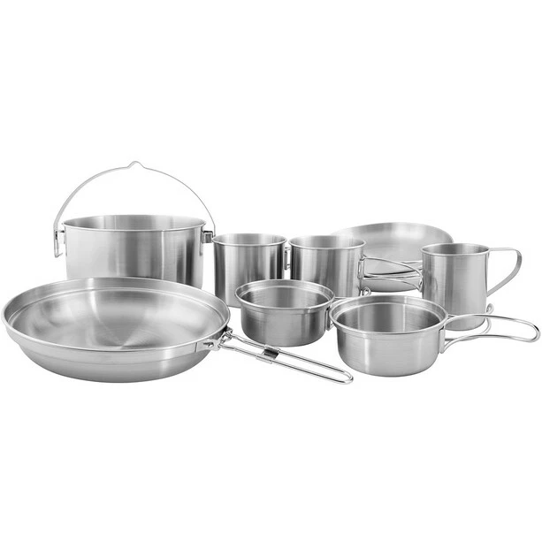 Set for a picnic for three. With volume scaling in the pot and in the cups. 3 plates, 2 mugs with lids and folding handles, 1 mug with handle, 1 pot with lid – all packed in a practical, washable mesh bag.