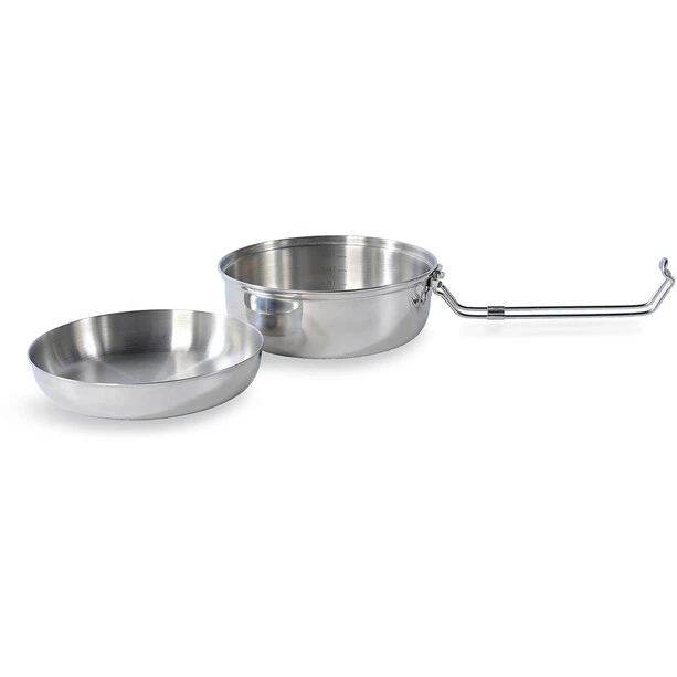 Saucepan and lid. Or bowl and plate – whichever you happen to need. The fold-down handle on the saucepan also doubles as a clamp lock for the set. Available in three sizes.