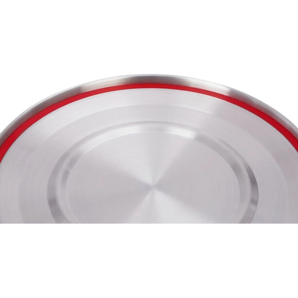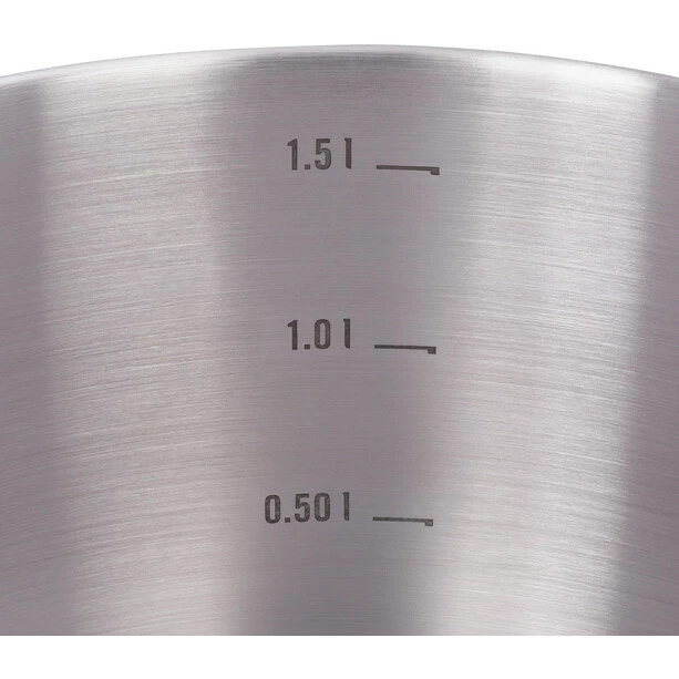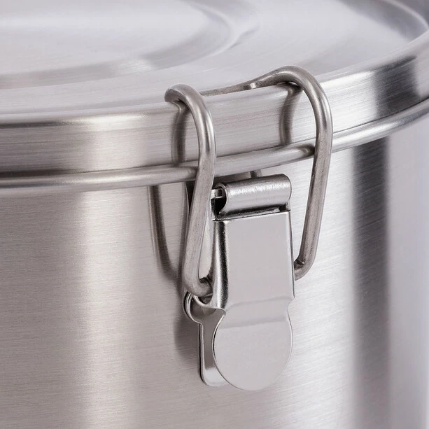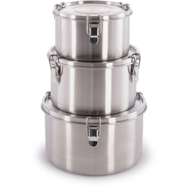 Stainless steel pot set consisting of 3 pots. Each pot has a lid with clip closure. The set can be stored in each other to save space.