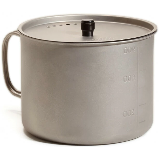 Ultra-light, large volume titanium mug. Remarkably stable and robust. Polished inner surface for simple cleaning. The holes in the lid ensure easy pouring. Perfect for your lightweight equipment as a beaker or pot.